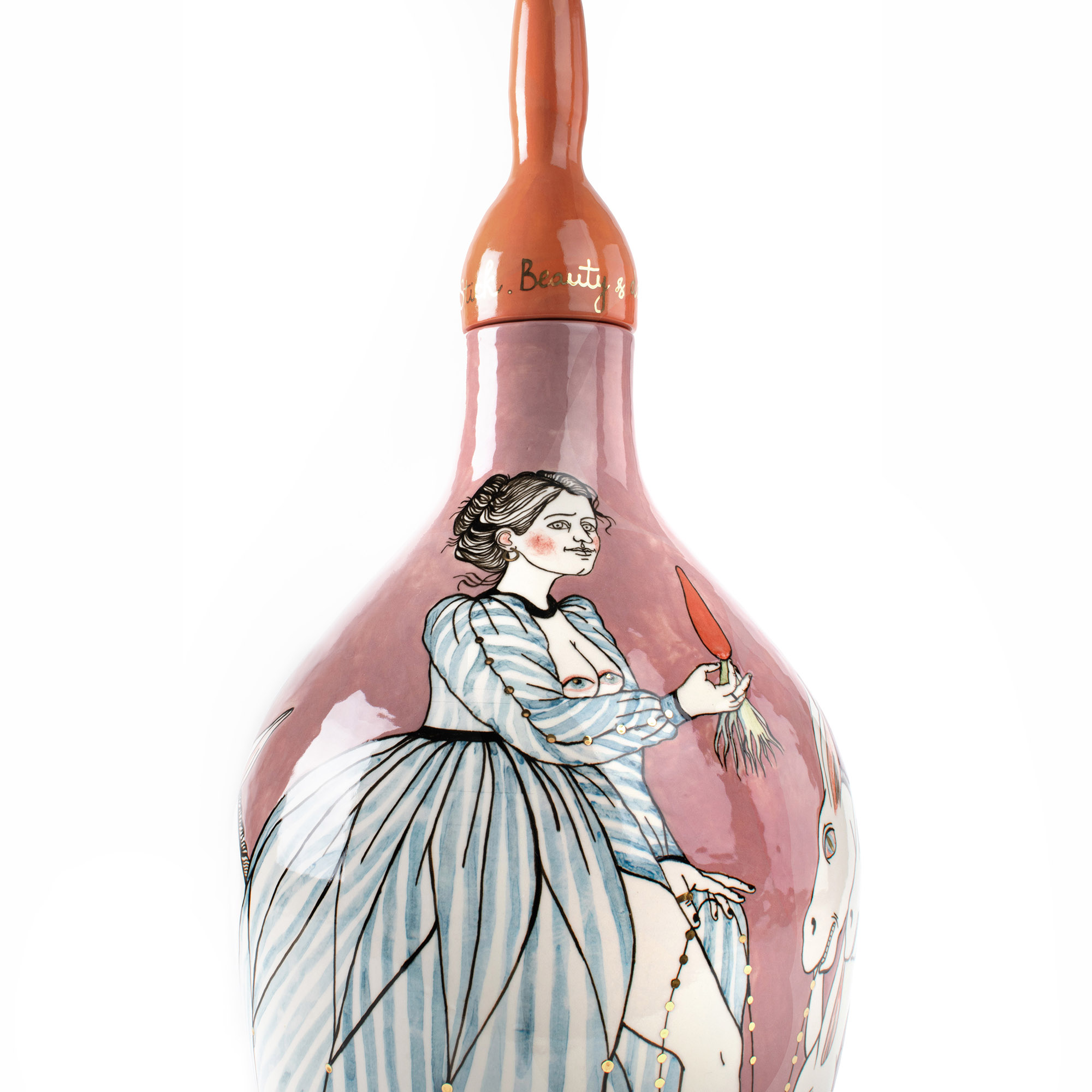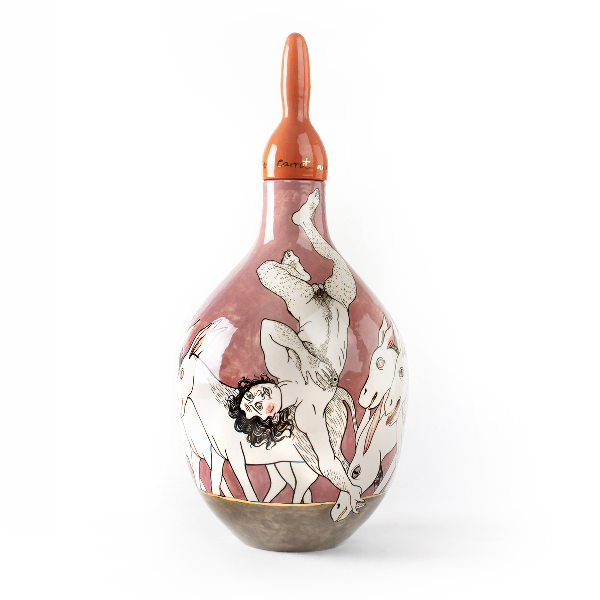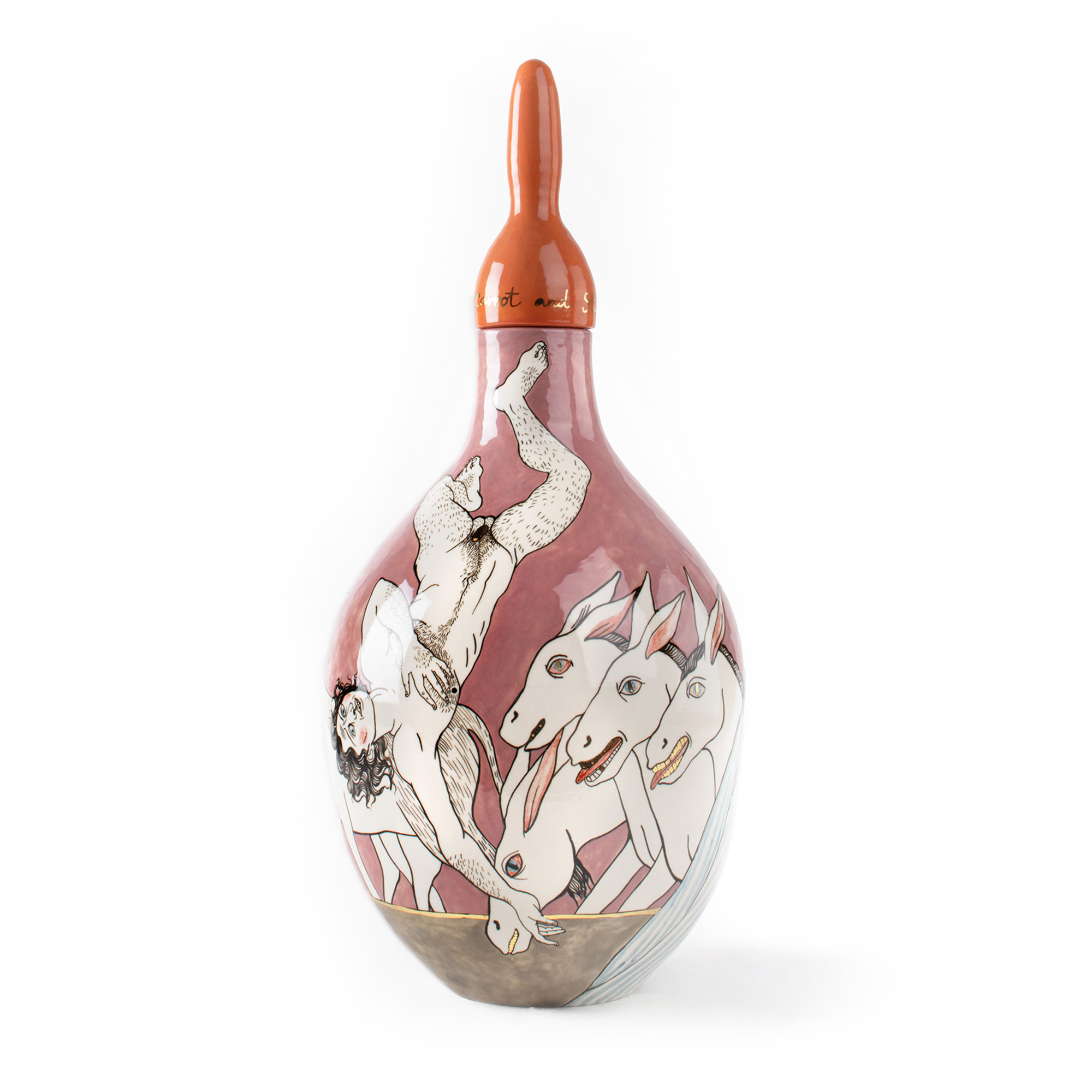 «Beauty and Donkeys“ 2024 58 x 25 x 25 cm ceramic vase, underglaze drawing, gold, triple fire.