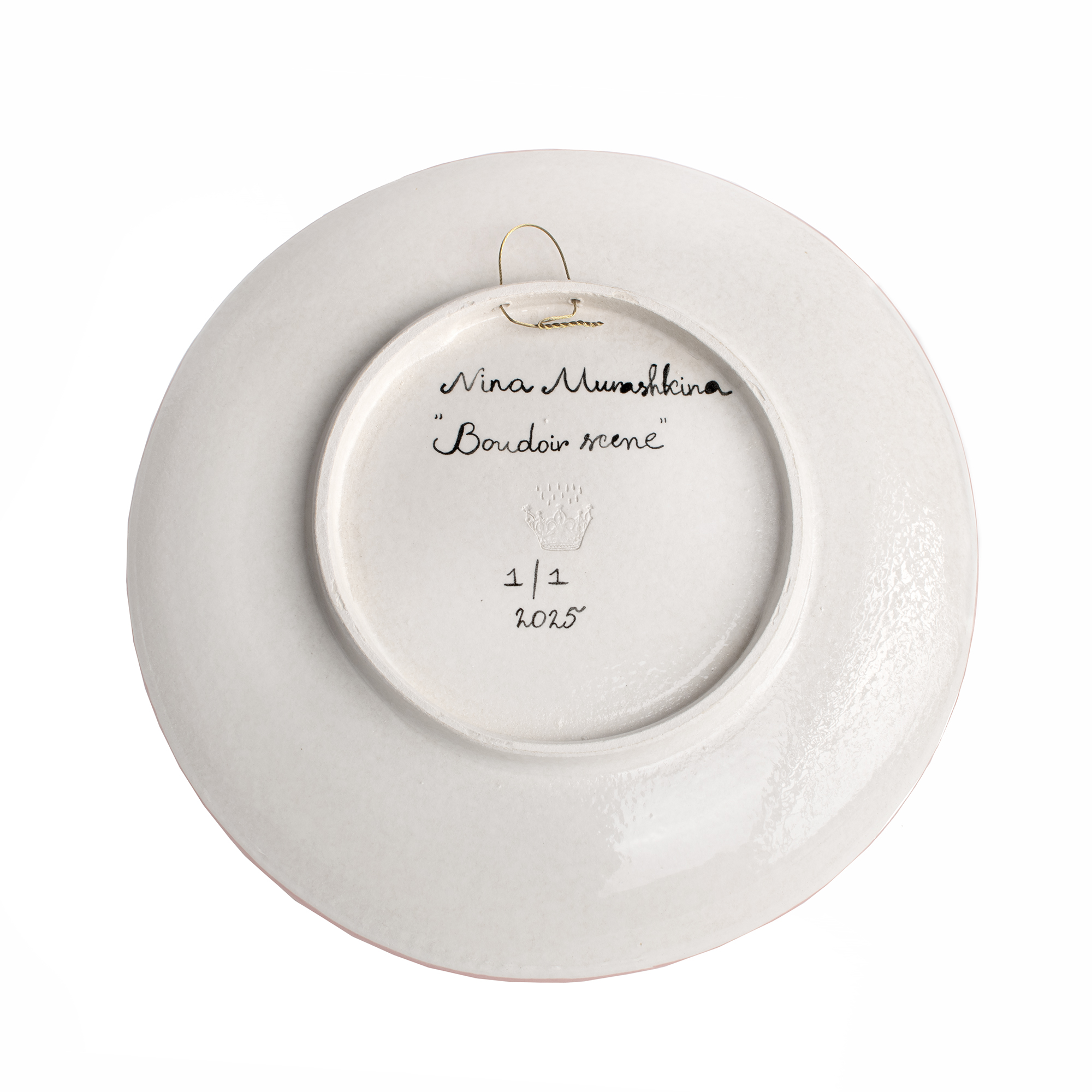 ceramic plate, underglaze drawing, gold, triple fire. diameter 32 cm, 2025.