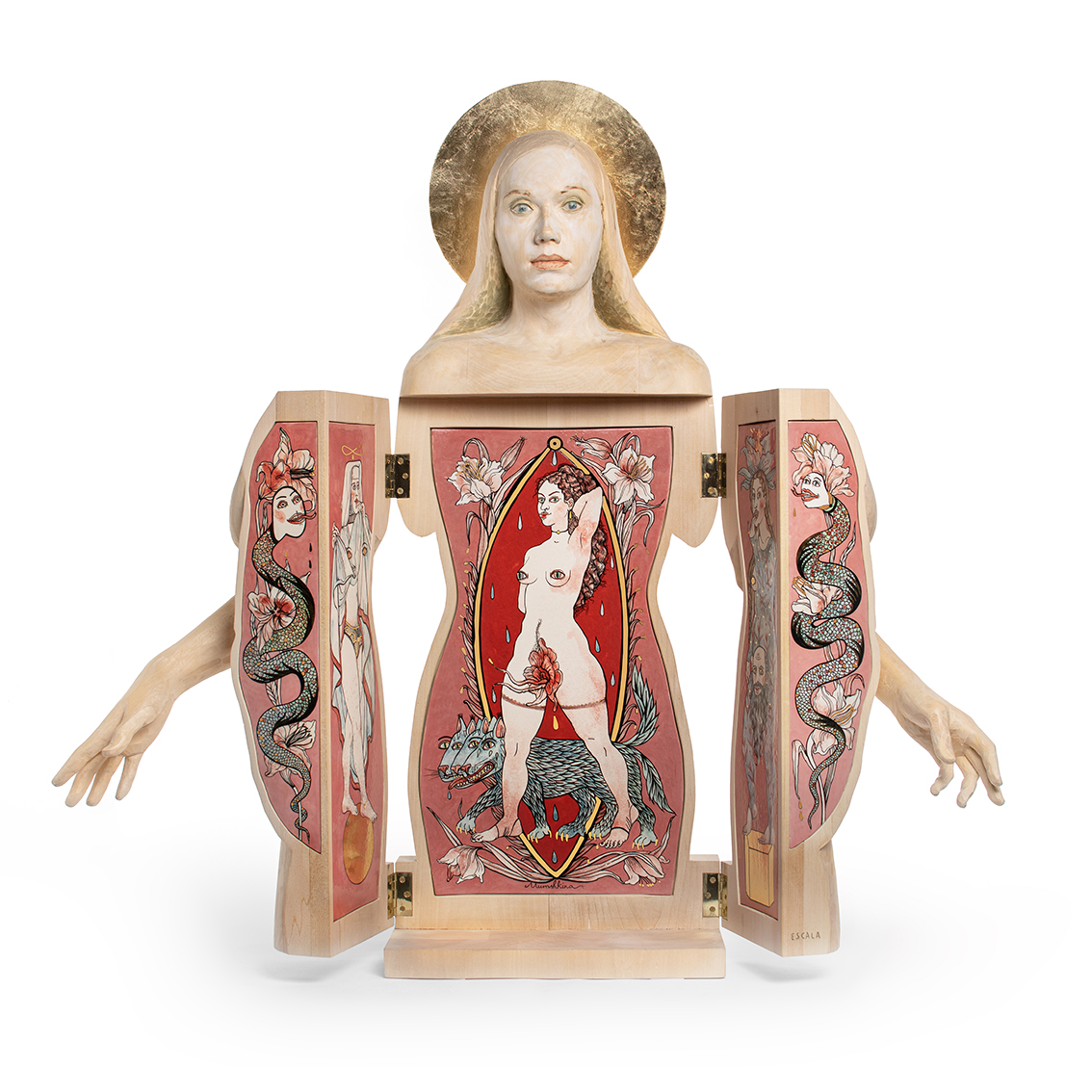 This piece continues the series Xavier Escala and Nina Murashkina began in 2018. While Goddess is not a religious artwork, it engages with the symbolism and form of the shrine madonna. It represents the idea of the divine within the human being: a woman who opens up and transforms into the temple of a feminine deity. She is identified as a goddess through symbolic elements such as the lunar crown (linked to the Egyptian goddess Hathor), the depiction of an inner image, and the presence of snakes (referencing the Egyptian goddess Wadjet).