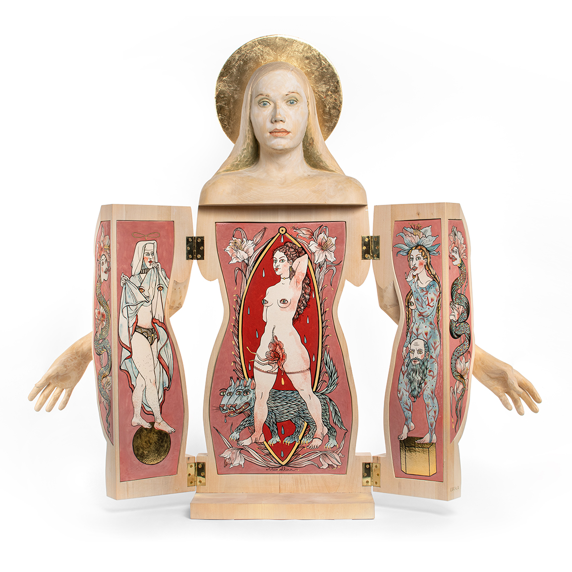 Inside part: Three different female figures within the sculpture represent three different states of female nature: the Warrior or Running with the Wolves, the Temptress or Lilith, and the Immaculate Virgin with moist eyes.
