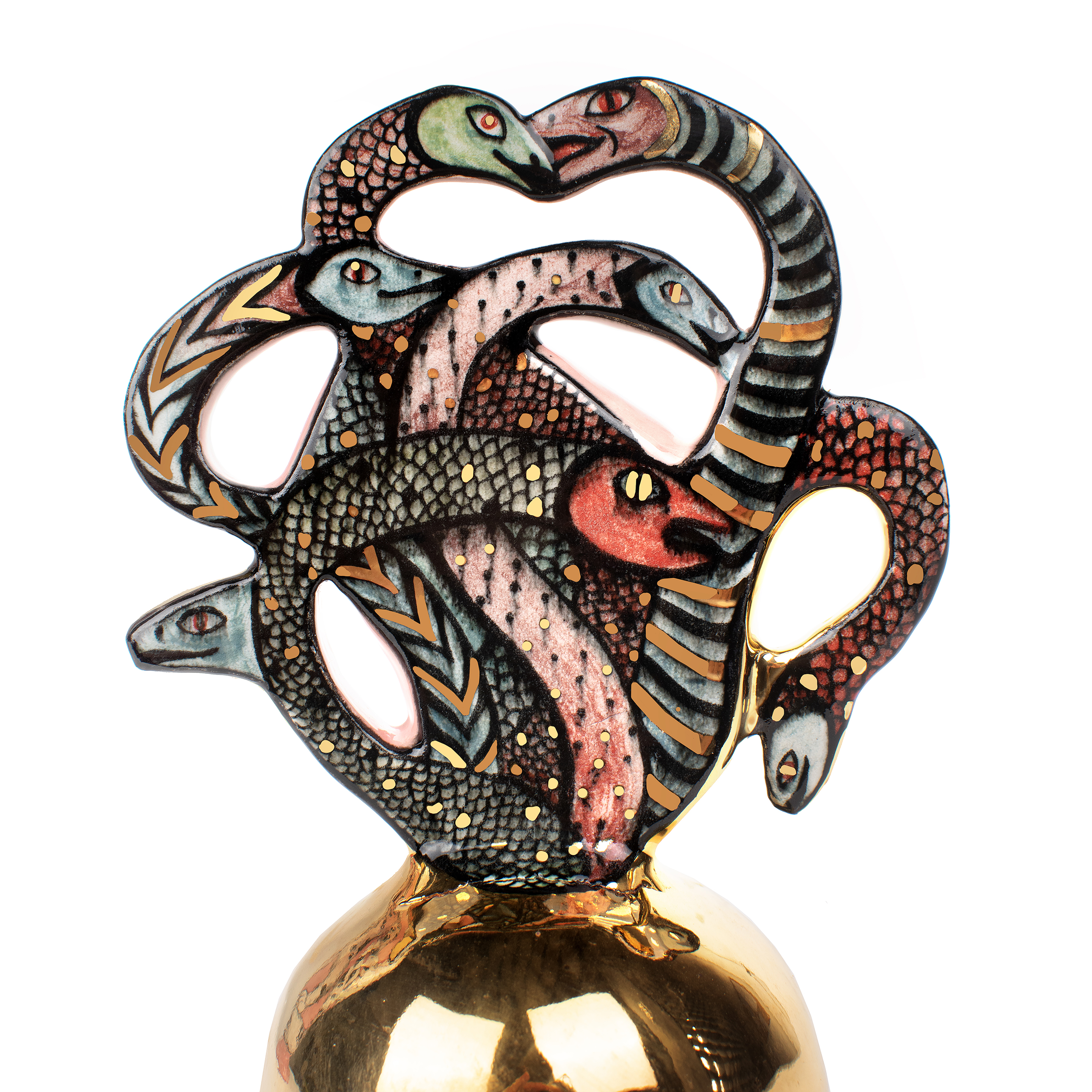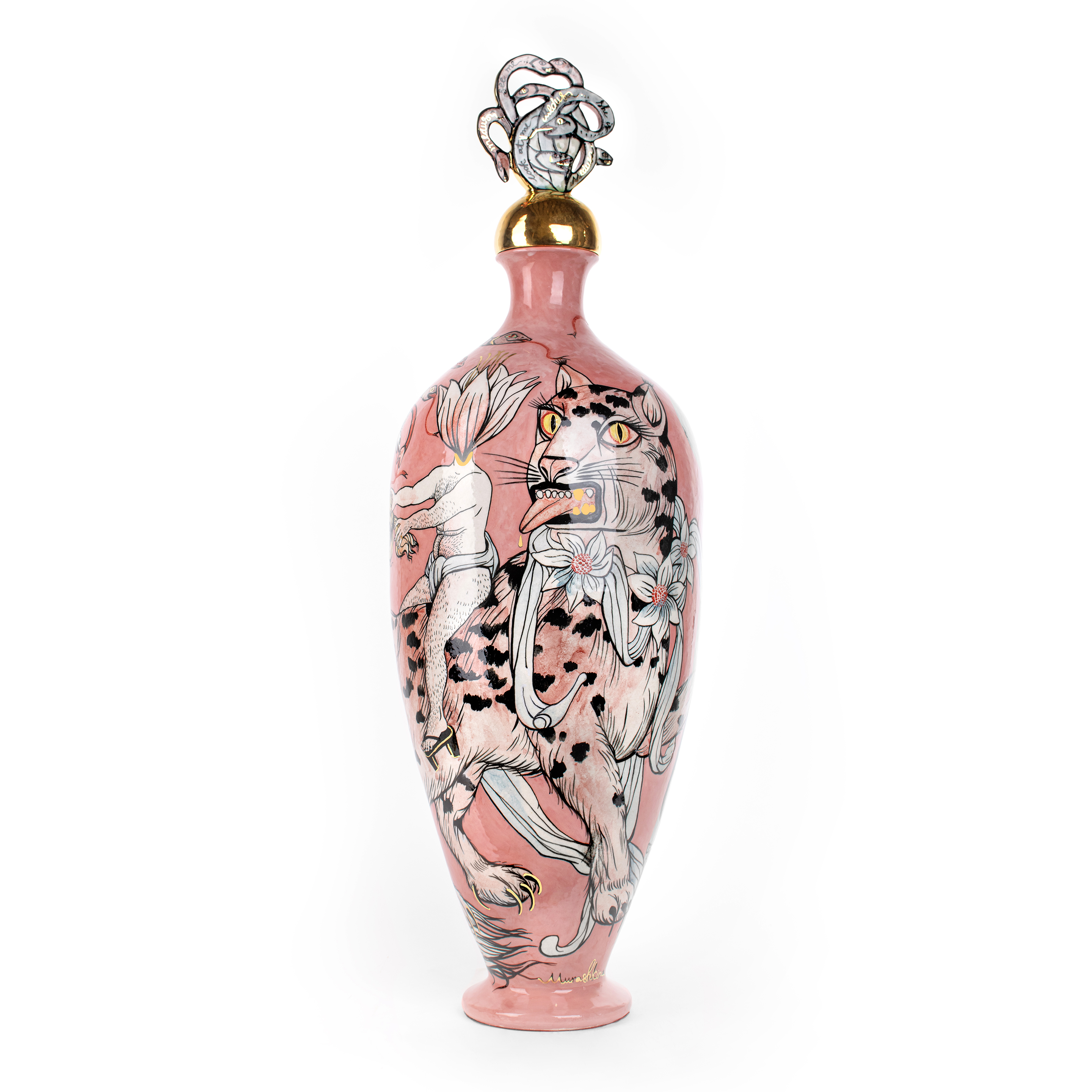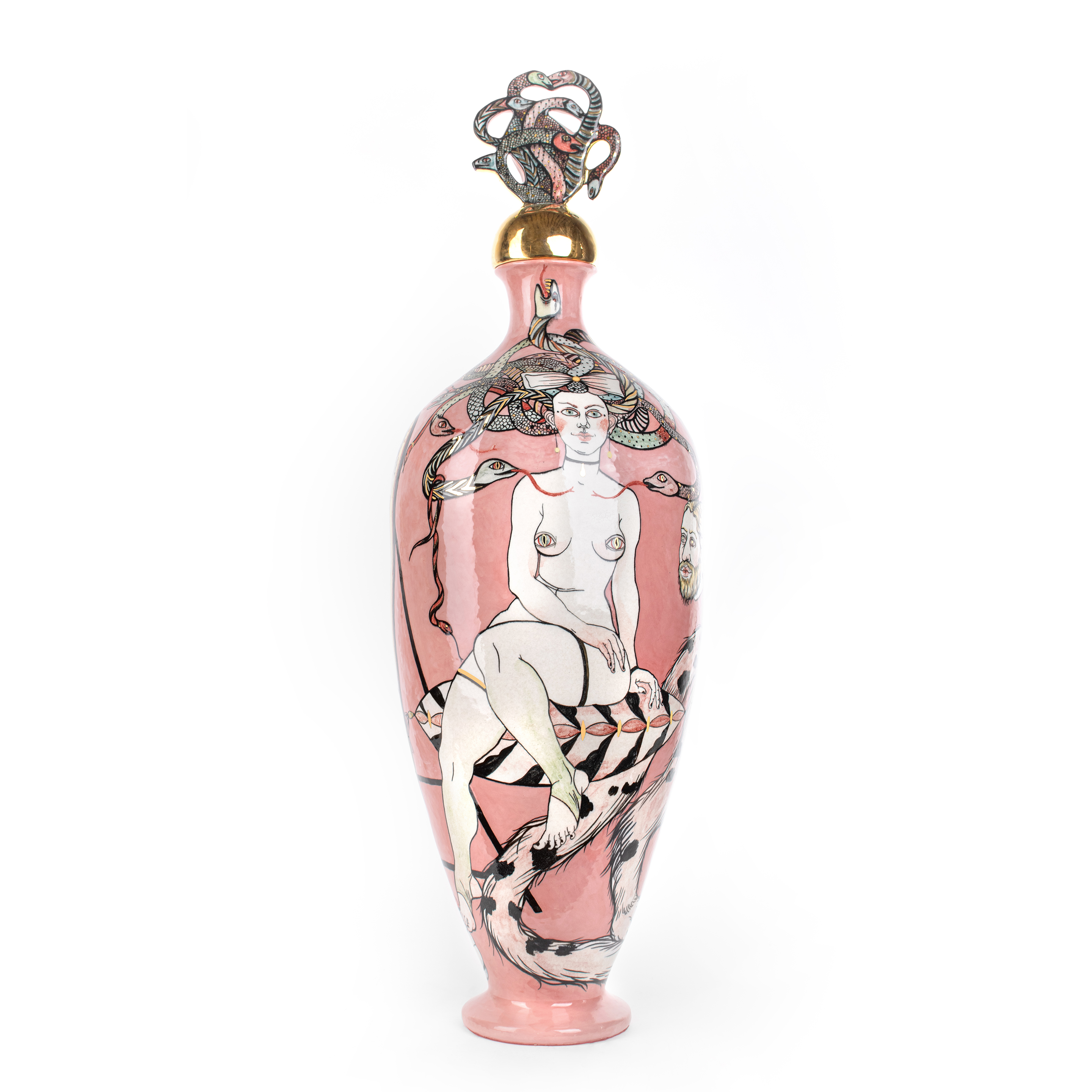 "Medusa" 2025 31 x 31 x 96 cm ceramic vase, underglaze drawing, gold, triple fire.One of my favorite plot of Greek mythology is a personage of Medusa. In my interpretation it’s a terribly beautiful woman killing strangers by her look.