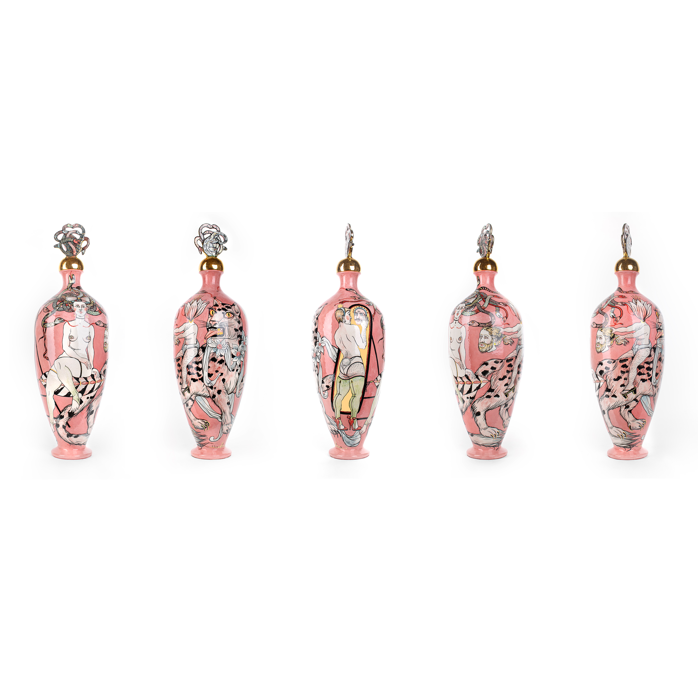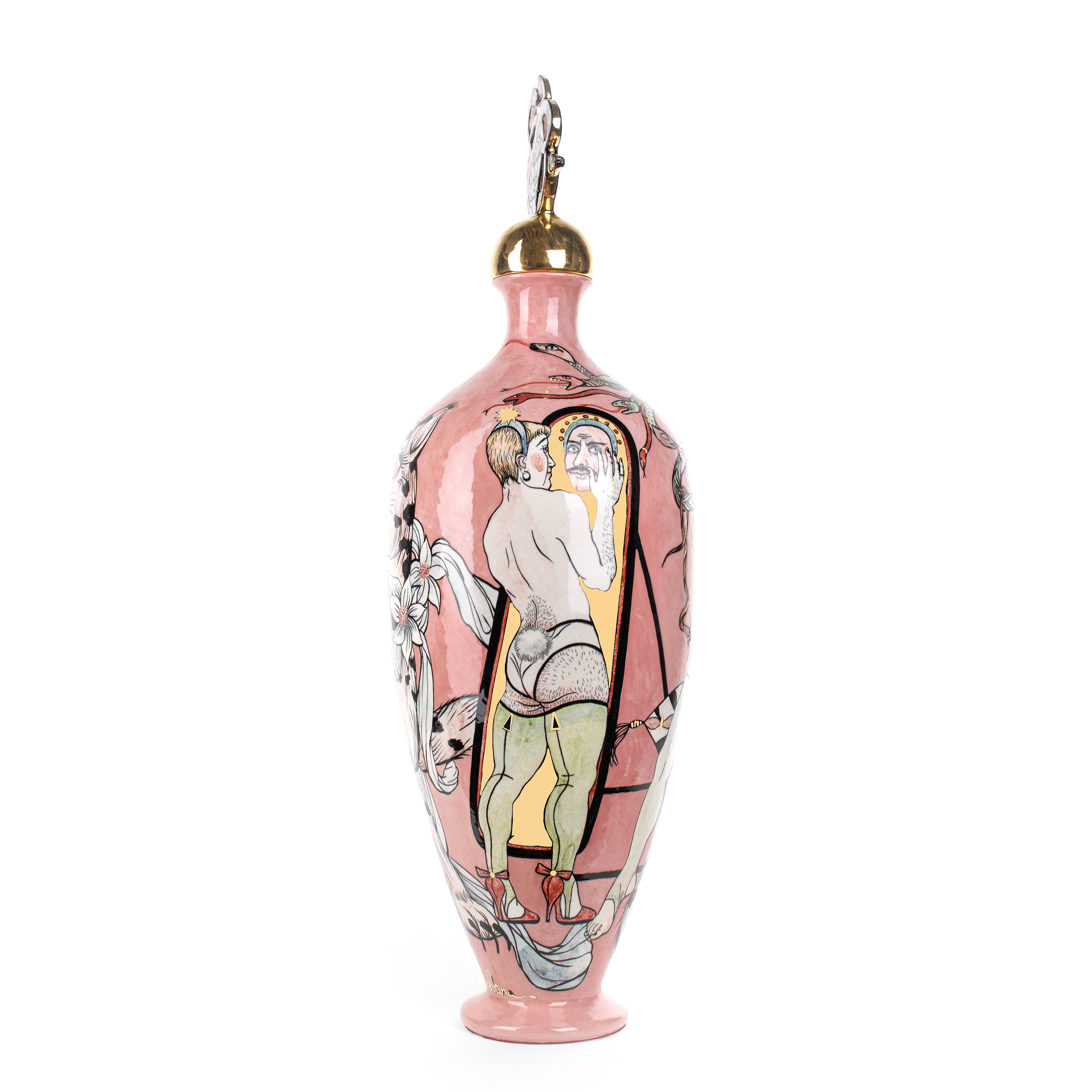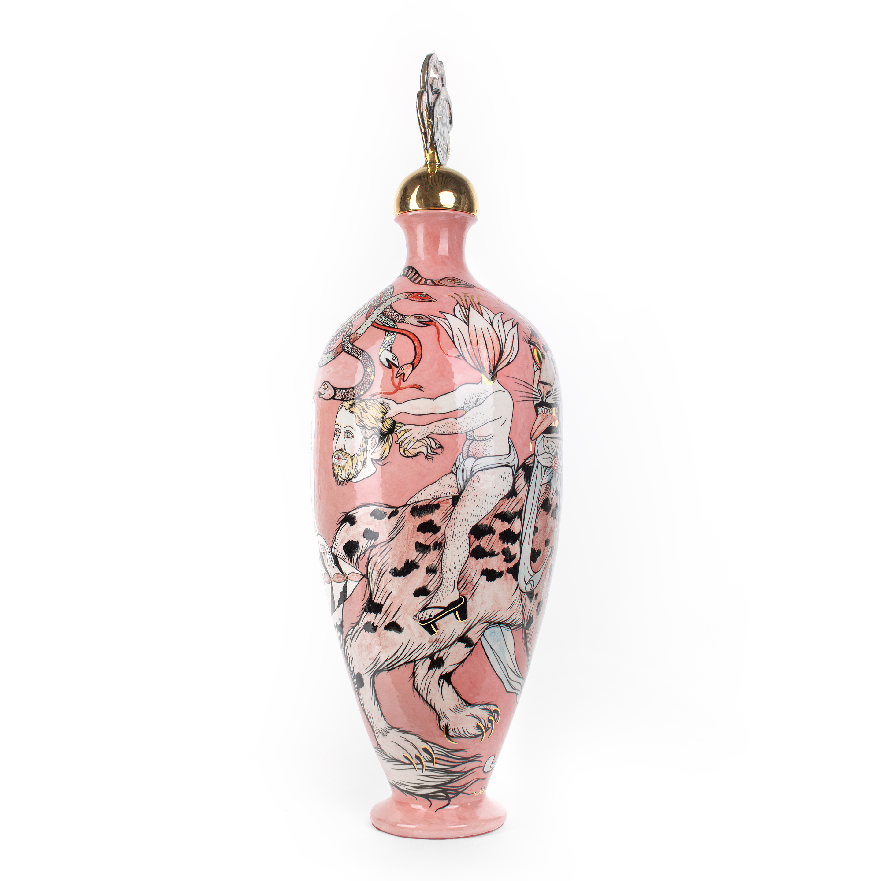 "Medusa" 2025 31 x 31 x 96 cm ceramic vase, underglaze drawing, gold, triple fire.One of my favorite plot of Greek mythology is a personage of Medusa. In my interpretation it’s a terribly beautiful woman killing strangers by her look.