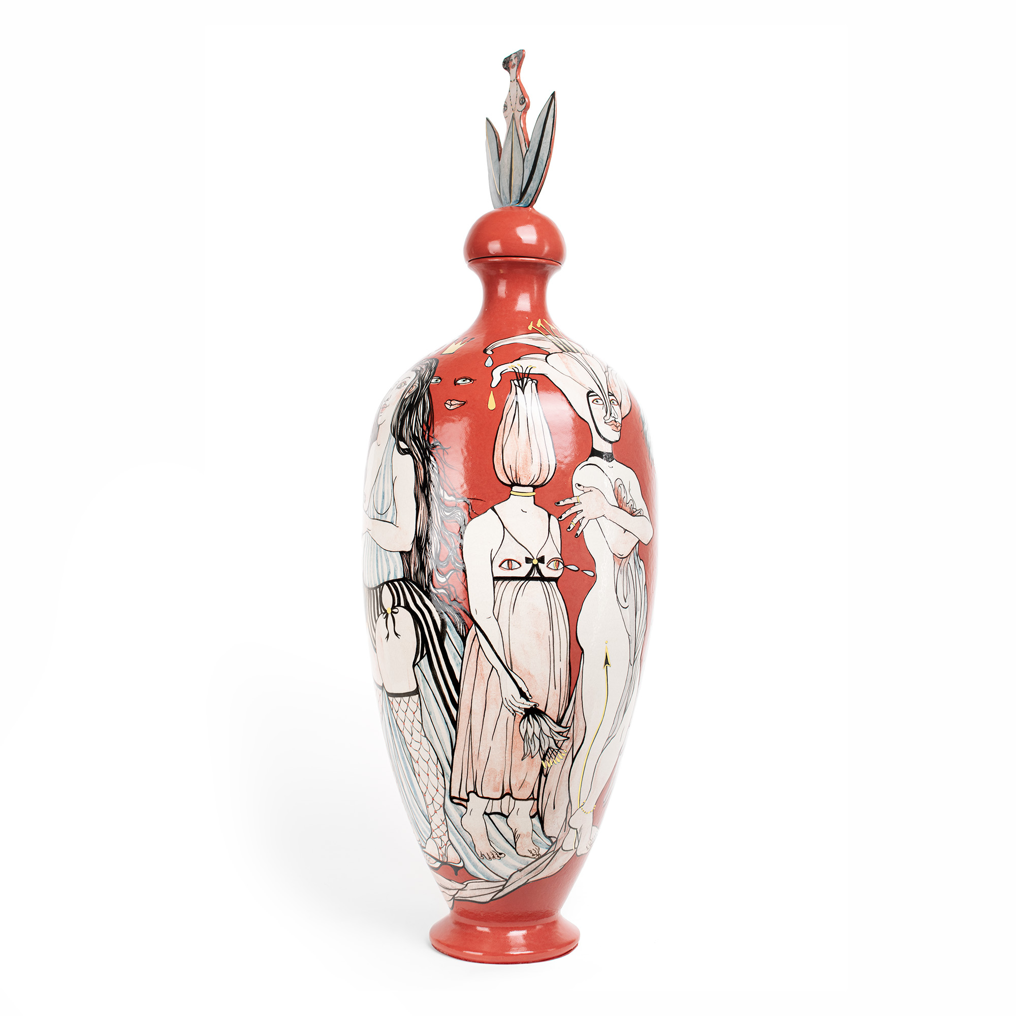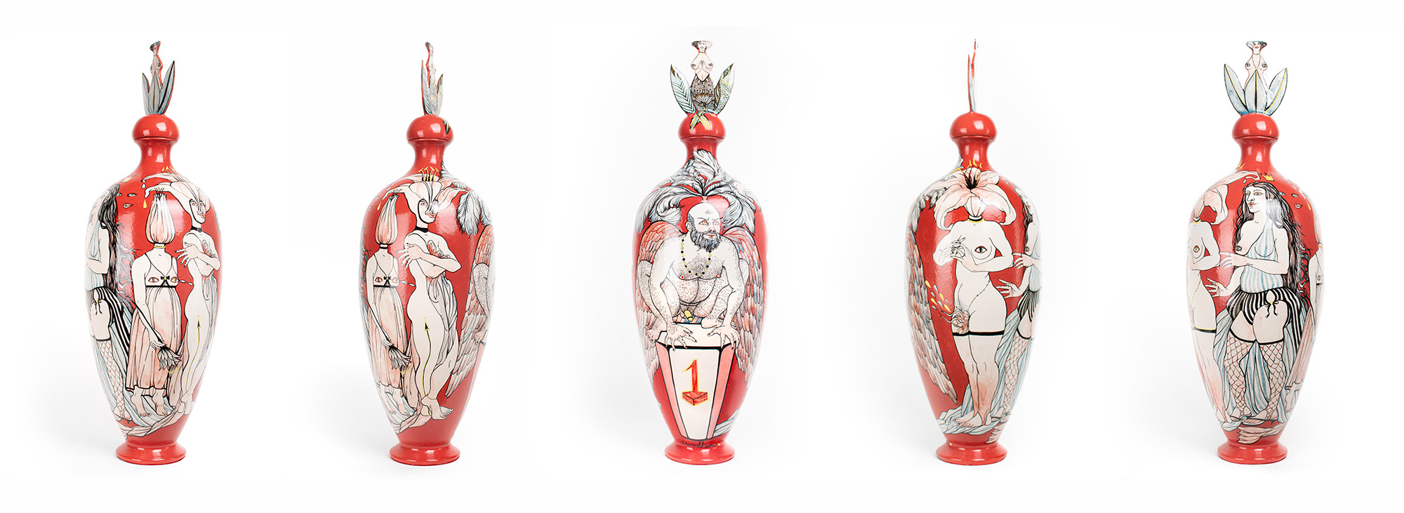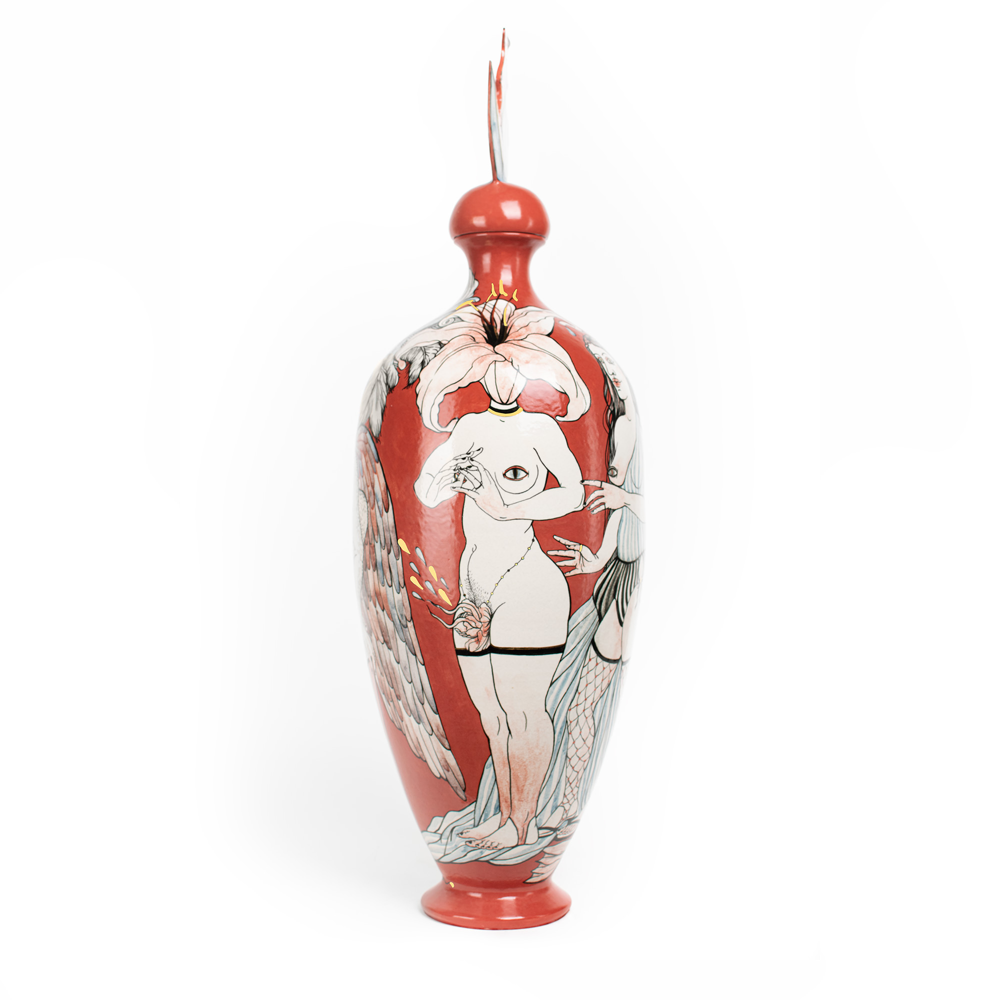 Ceramic vase, underglaze drawing, gold, triple fire.