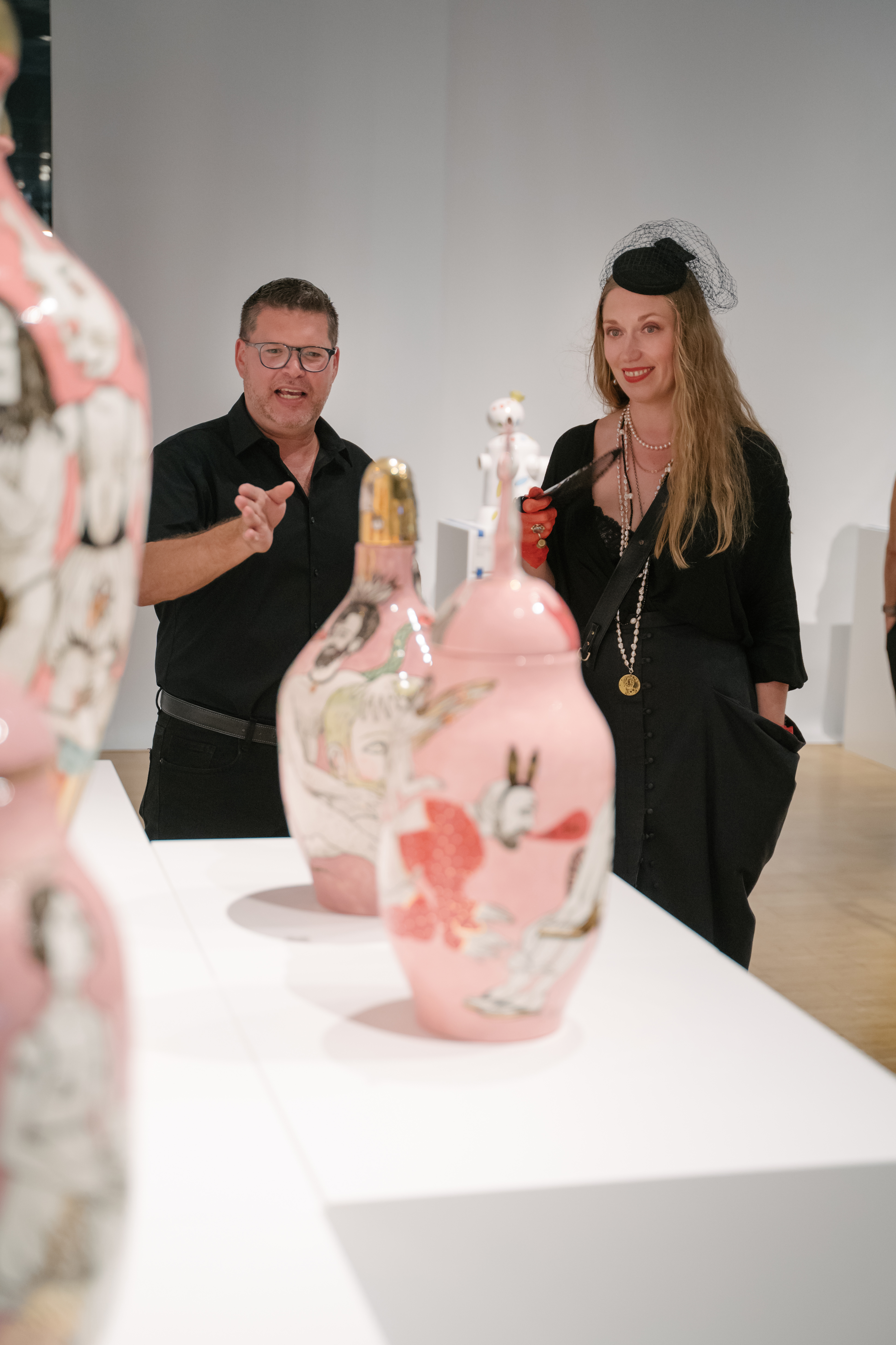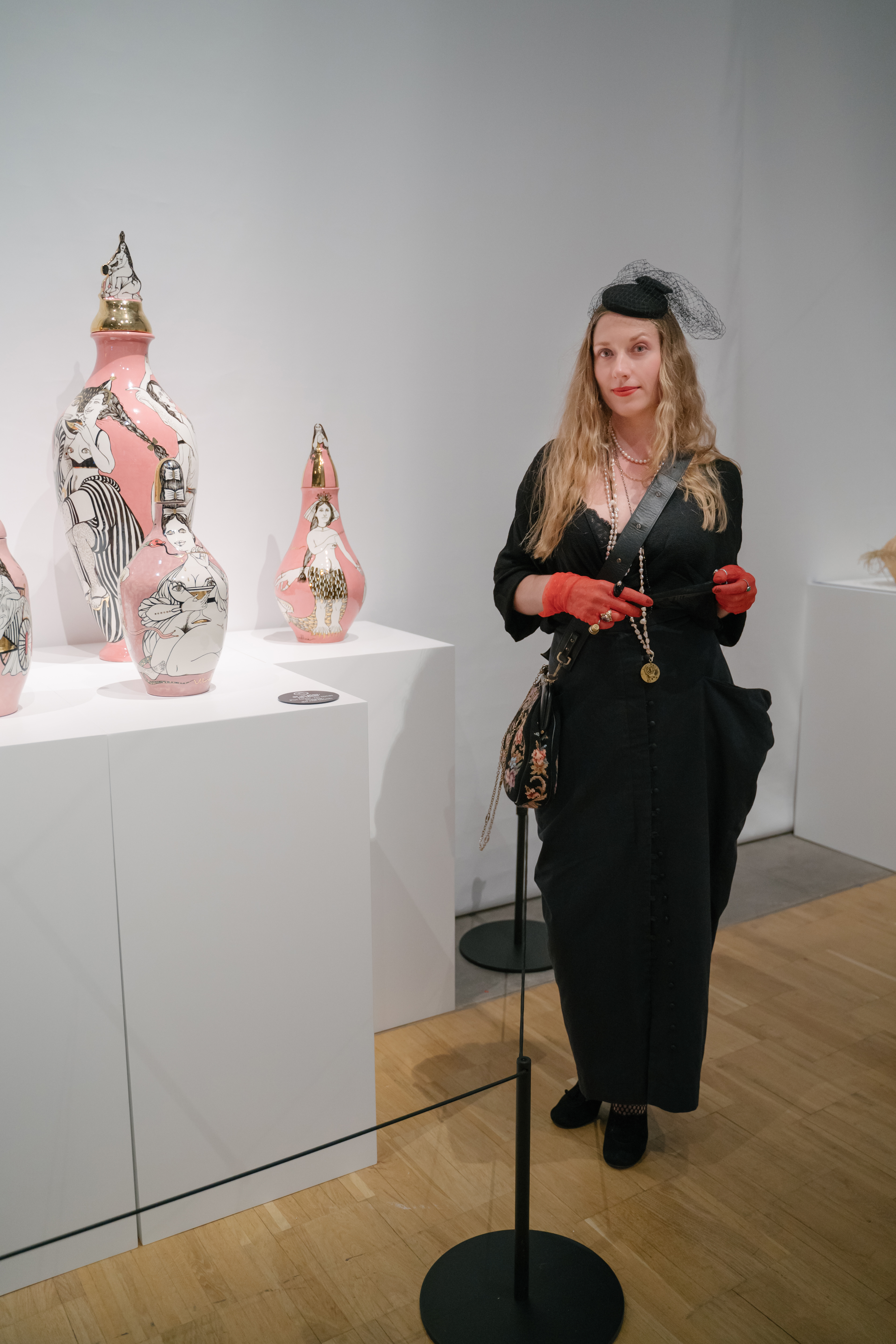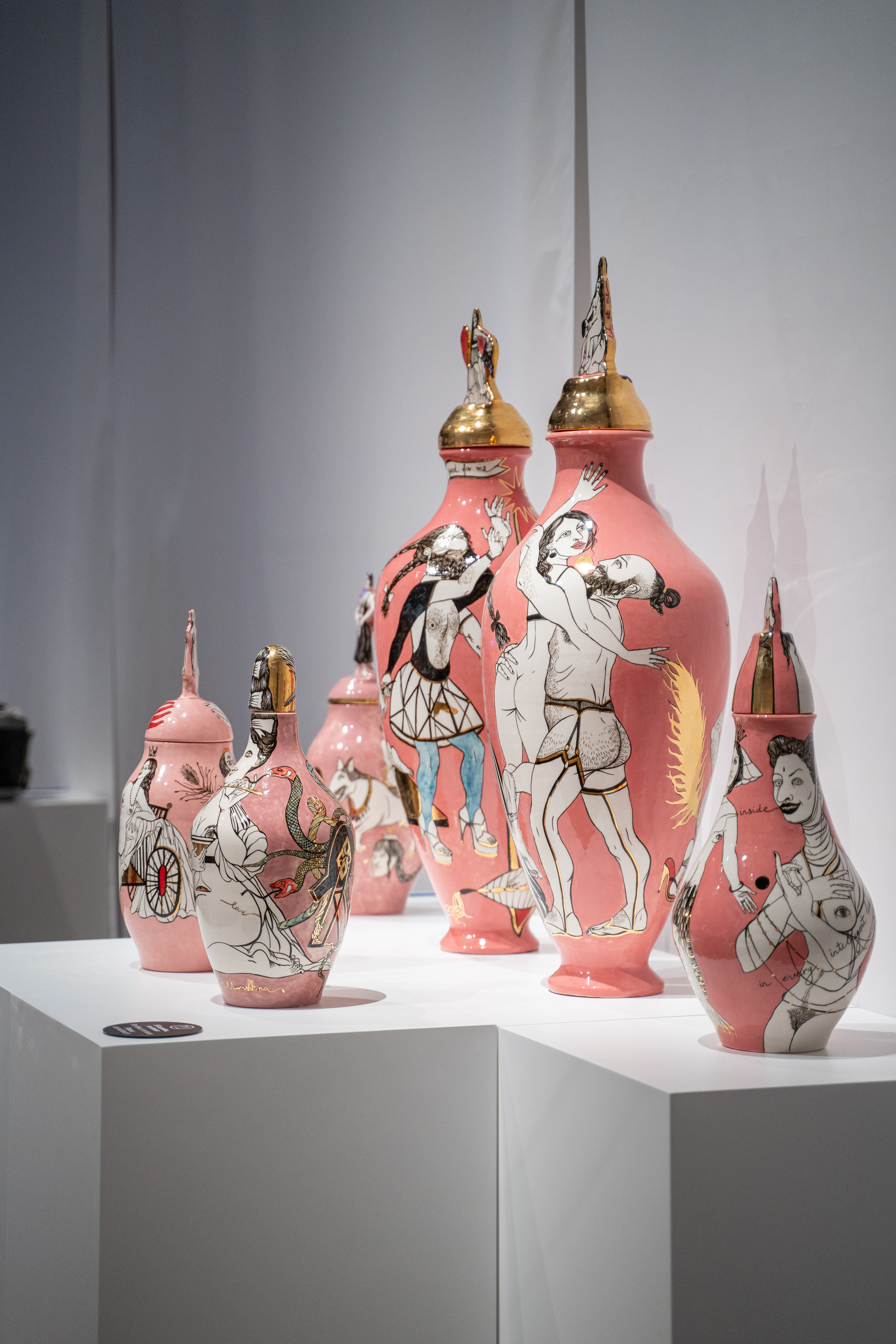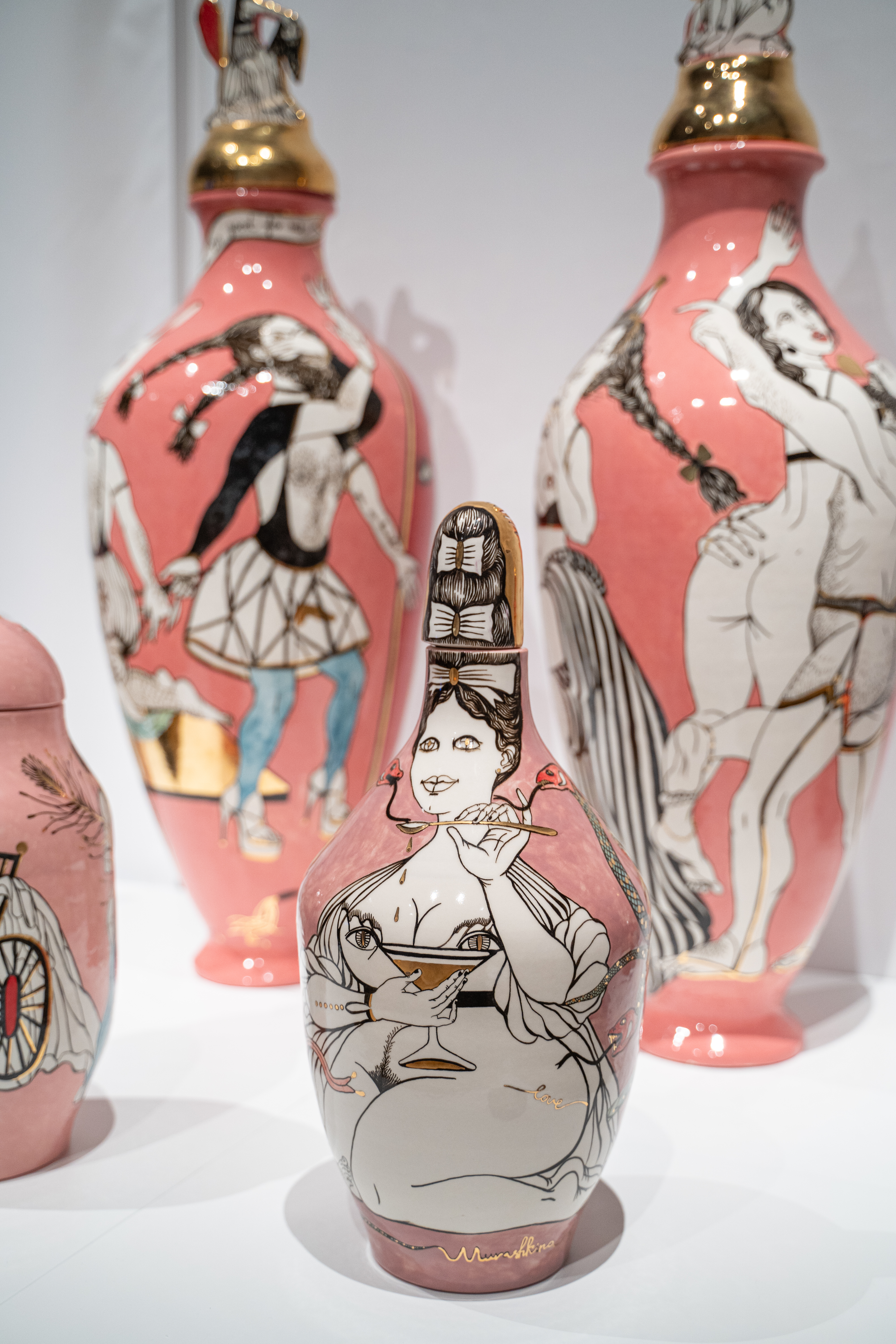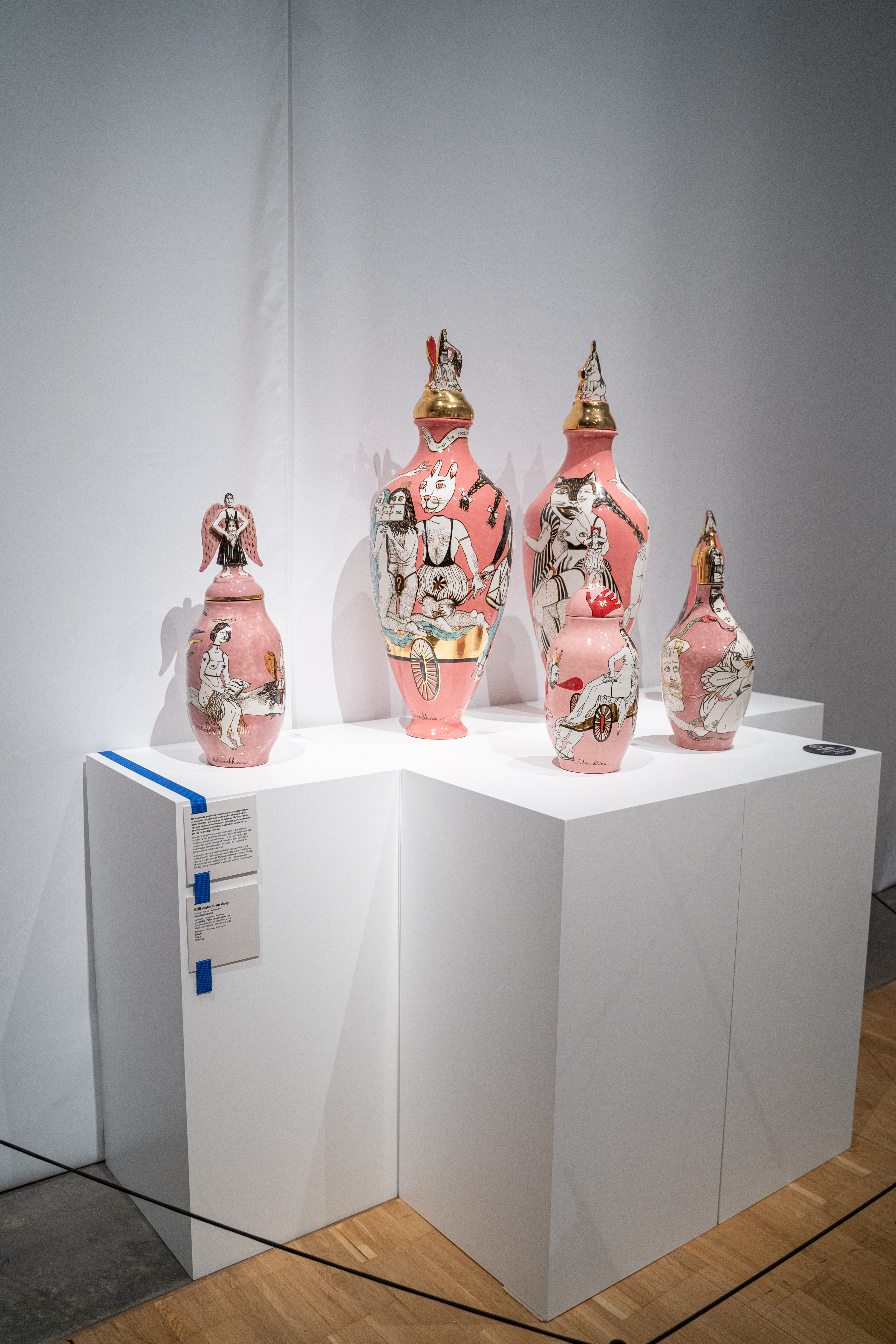 "A series of ceramic vases in which I explore the theme of internal passions and sensuality in each story and individual character. The pink tones give a feeling of femininity and sweetness, but the plots are frankly daring. Inspired by a series of vases from ancient Greece.