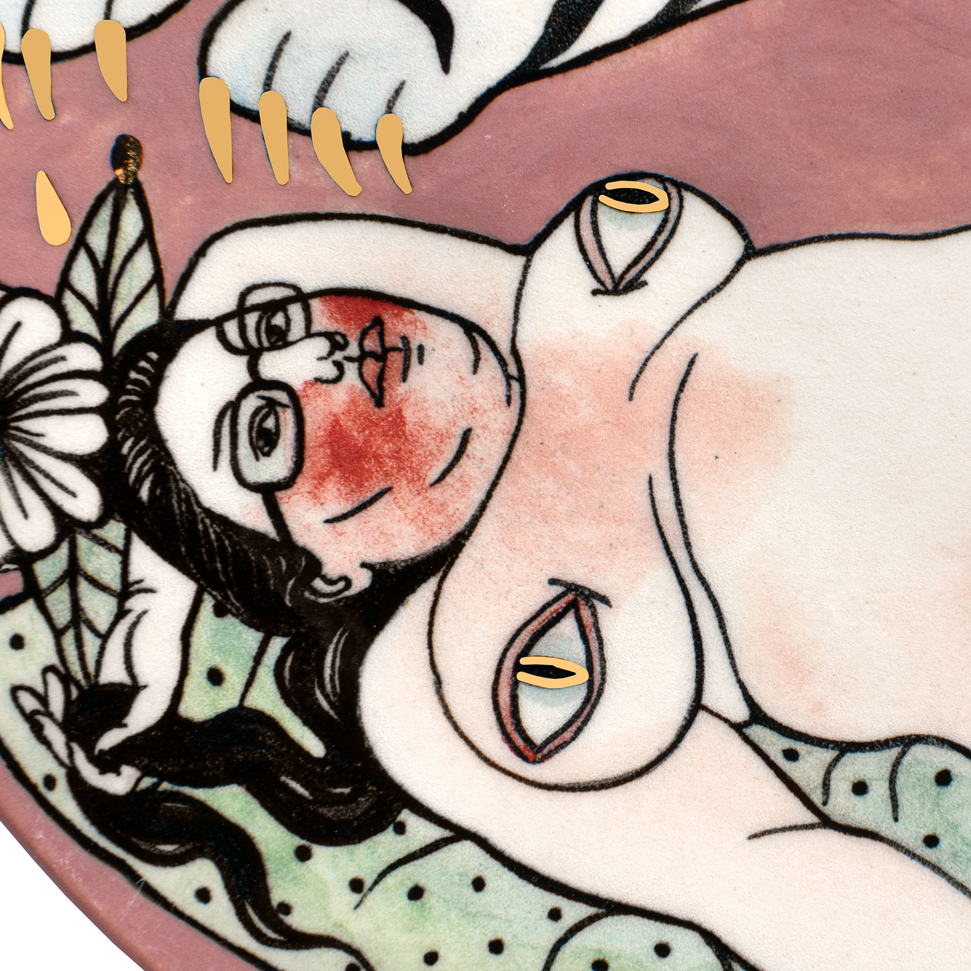 ceramic plate, underglaze drawing, gold, triple fire.