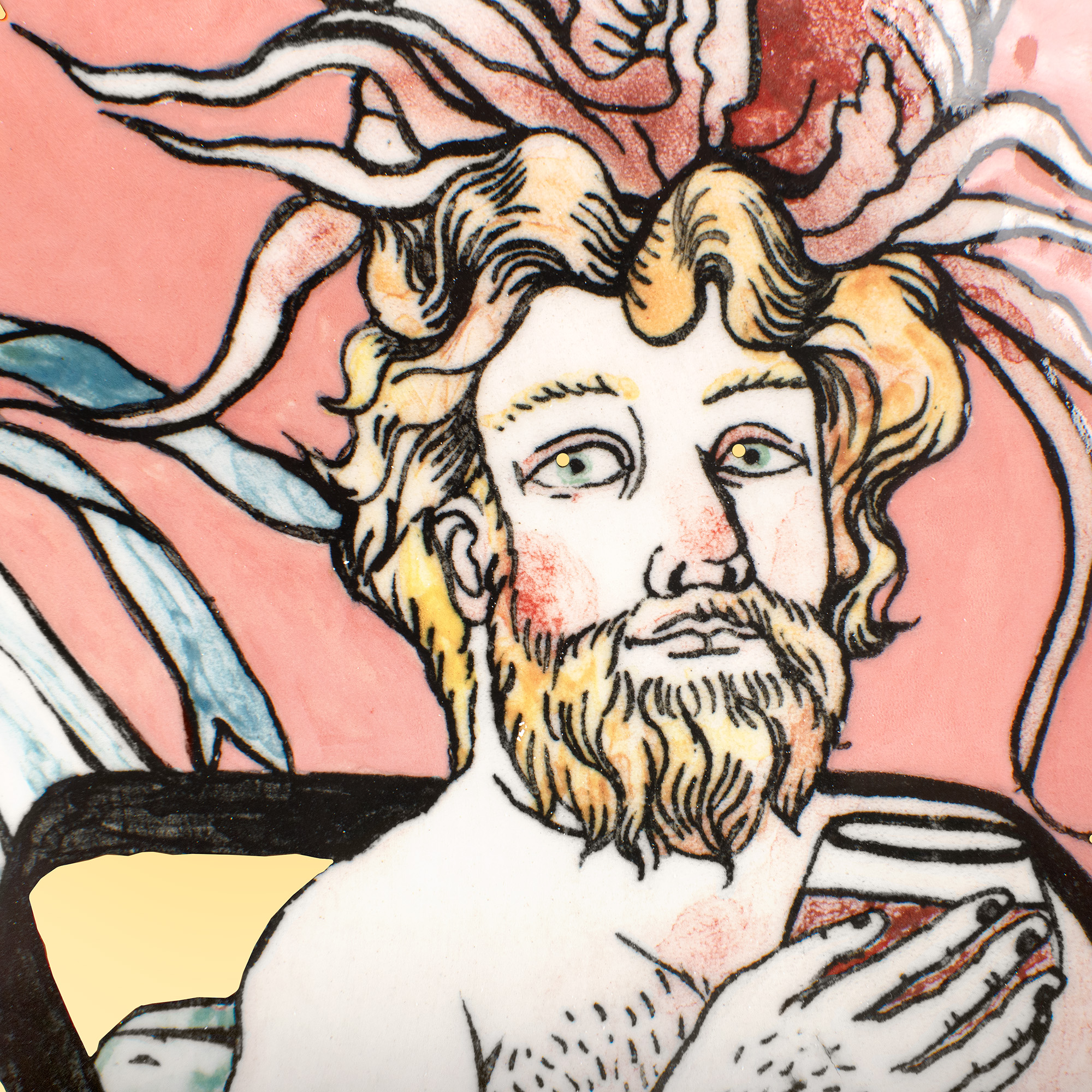 ceramic plate, underglaze drawing, gold, triple fire. diameter 32 cm, 2025.