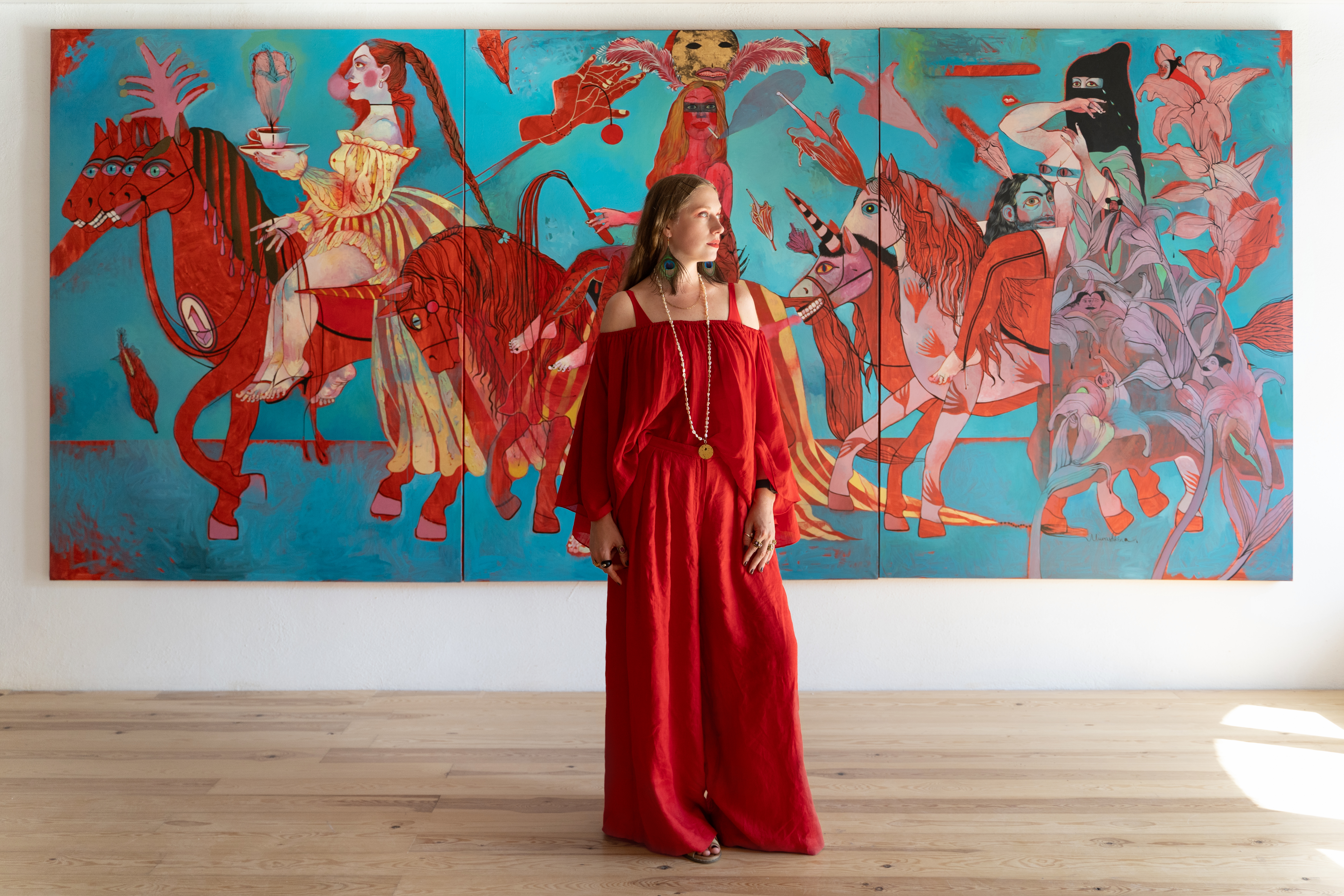 “Conquistadoras” 2024, 200 x 450 cm, acrylic, golden leaf, linen.