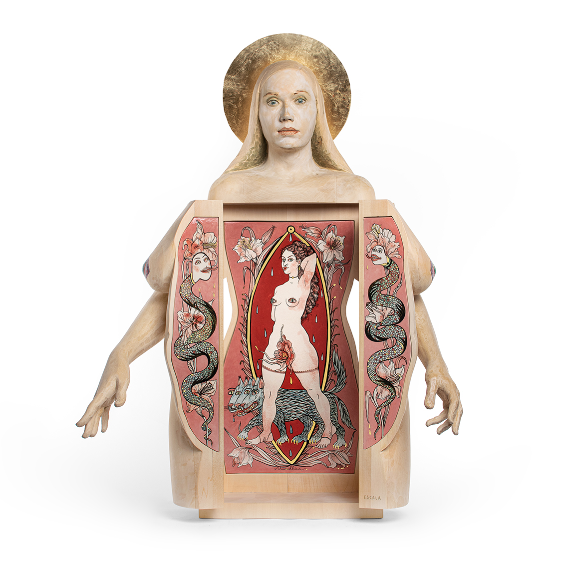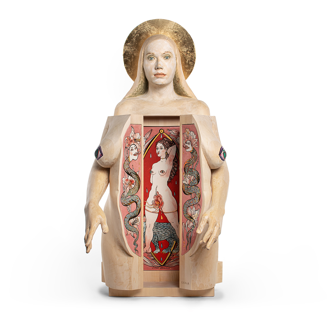This piece continues the series Xavier Escala and Nina Murashkina began in 2018. While Goddess is not a religious artwork, it engages with the symbolism and form of the shrine madonna. It represents the idea of the divine within the human being: a woman who opens up and transforms into the temple of a feminine deity. She is identified as a goddess through symbolic elements such as the lunar crown (linked to the Egyptian goddess Hathor), the depiction of an inner image, and the presence of snakes (referencing the Egyptian goddess Wadjet).