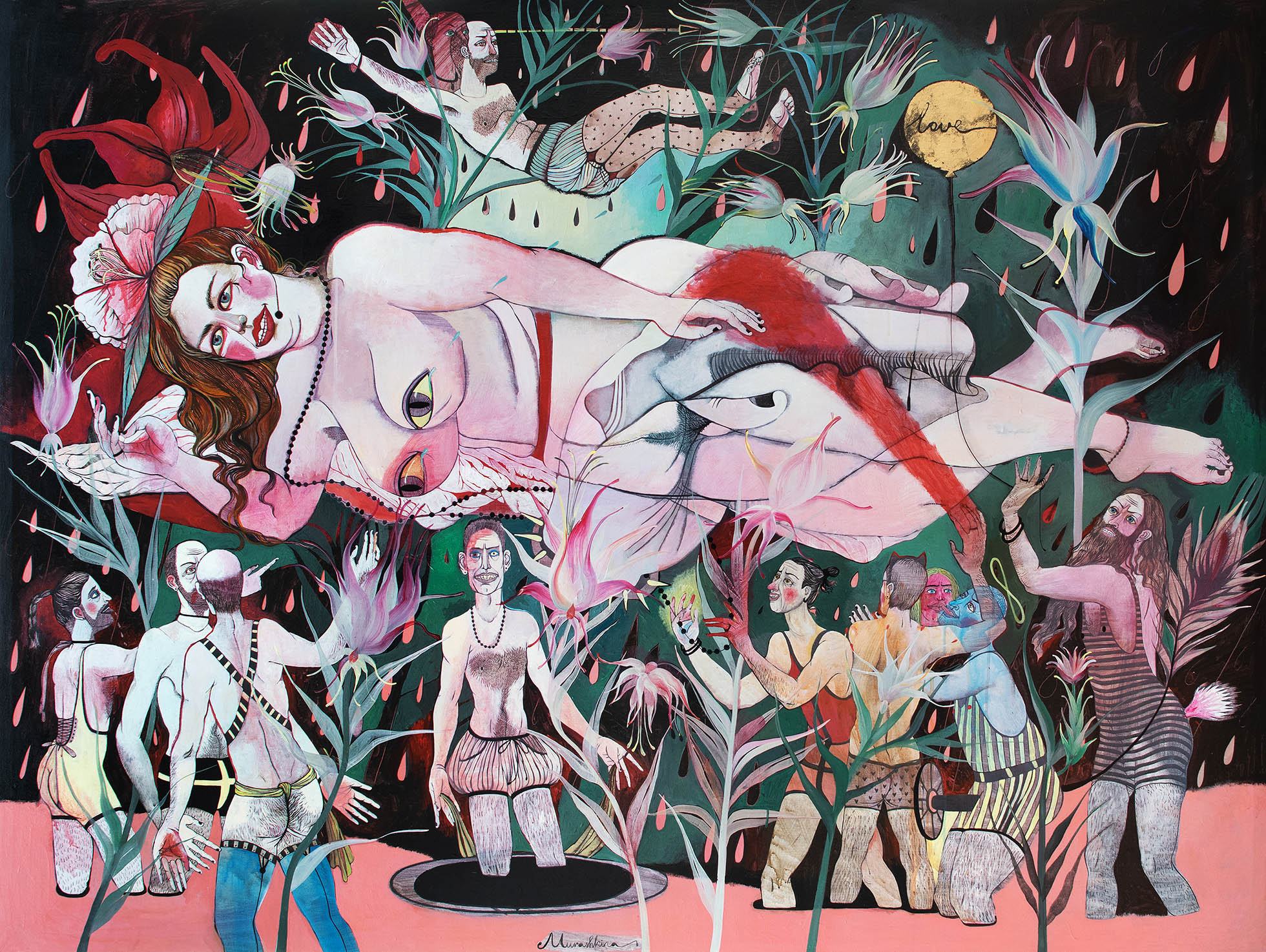 150 x 200 cm, ink, acrylic, golden leaf. 2024